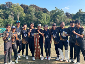 Then, off the final ball of the penultimate over, Obhrai pulled off a masterful piece of batsmanship. Grimbaldeston, back into the attack, sent down a length delivery outside off stump at good pace. In a premeditated shot, Obhrai got down on one knee and skilfully flipped the ball over his left shoulder, where the backpedalling fine leg fielder could only get fingertips to the ball as it crept over the rope for six. Loud cheers erupted from the Sunbury supporters in the stands, with the most raucous emanating from the Boeing 777’s-worth of Obhrai family members who had made the trip across the pond to watch him play.